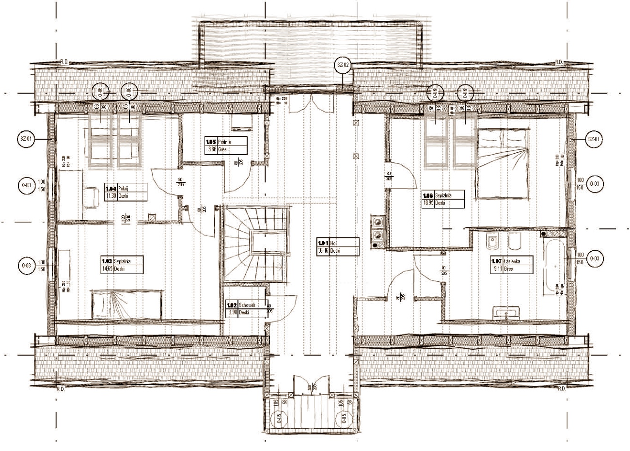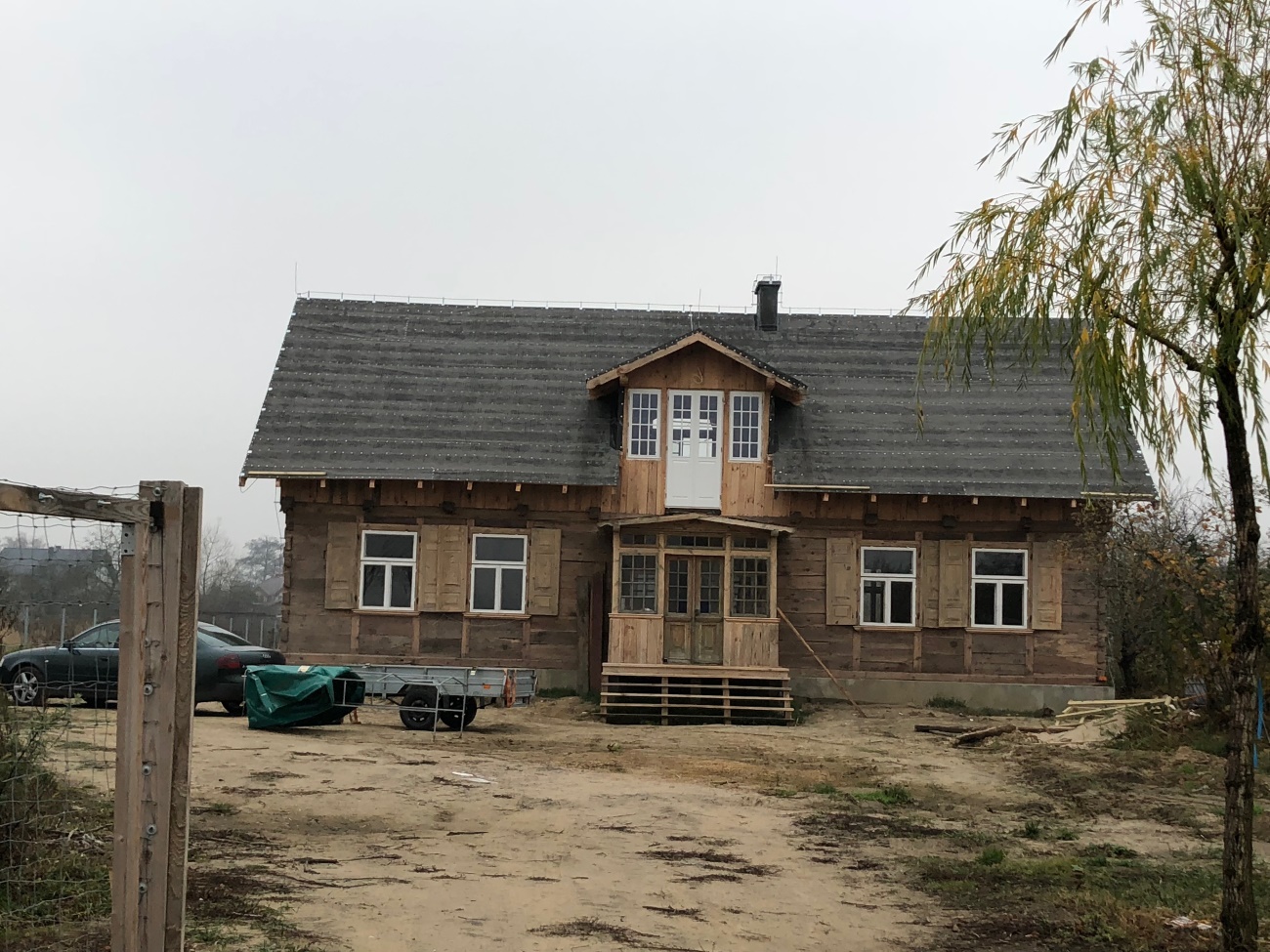 Ściany istniejącego budynku zbudowane są z bali 12cm, strop drewniany na balach ok 20x20cm, więźba – krokwie 10x15cm. Poddasze – do adaptacji.