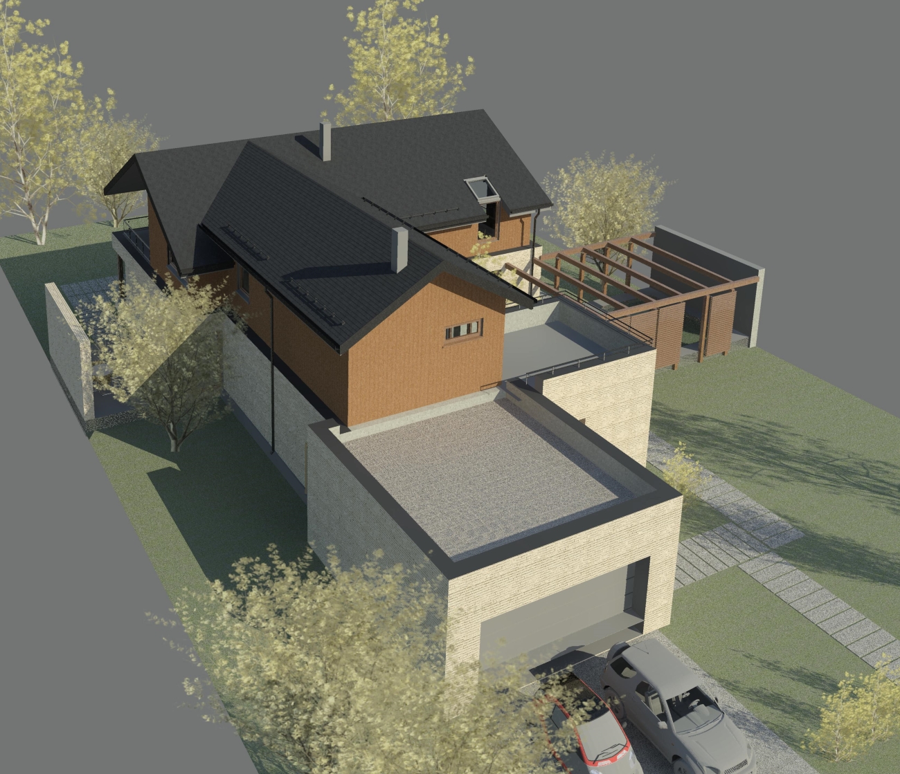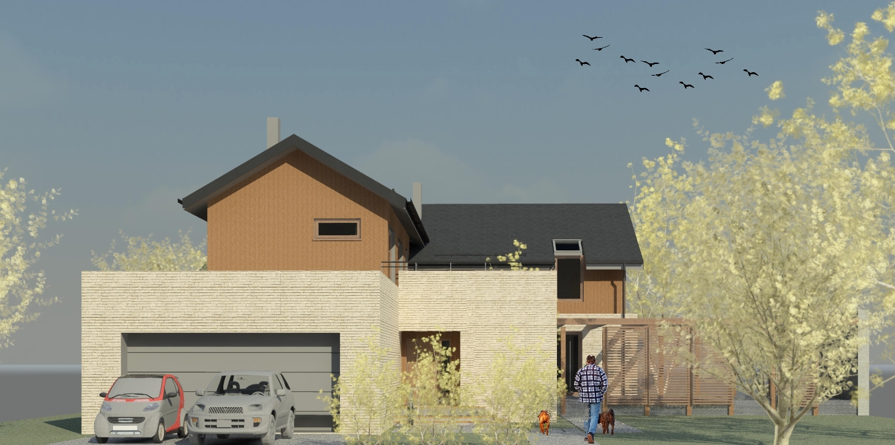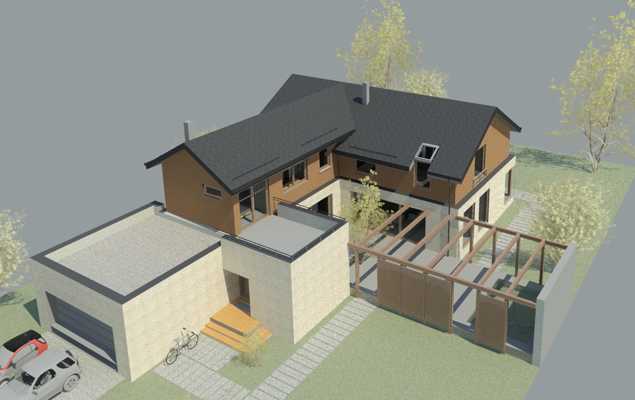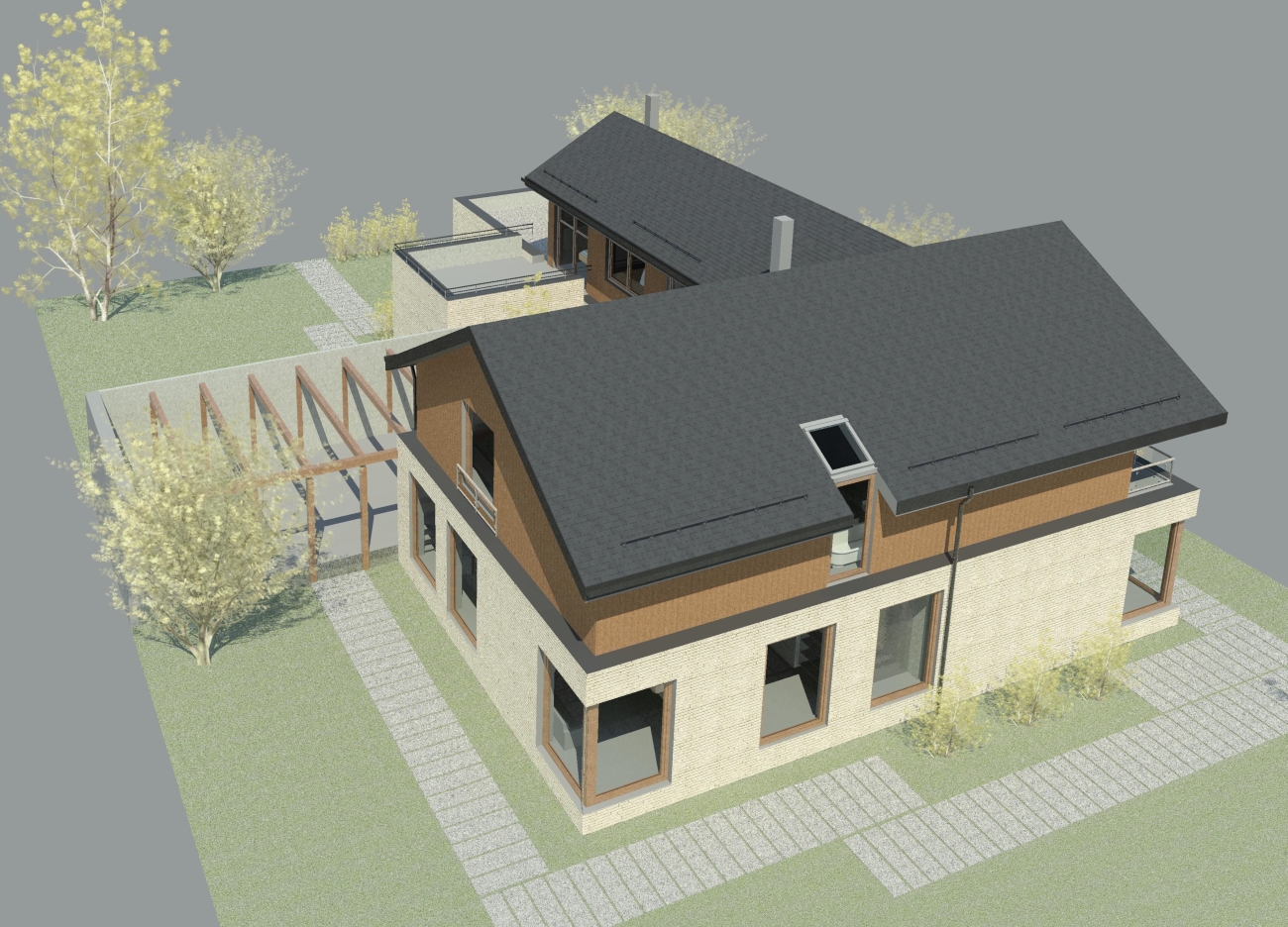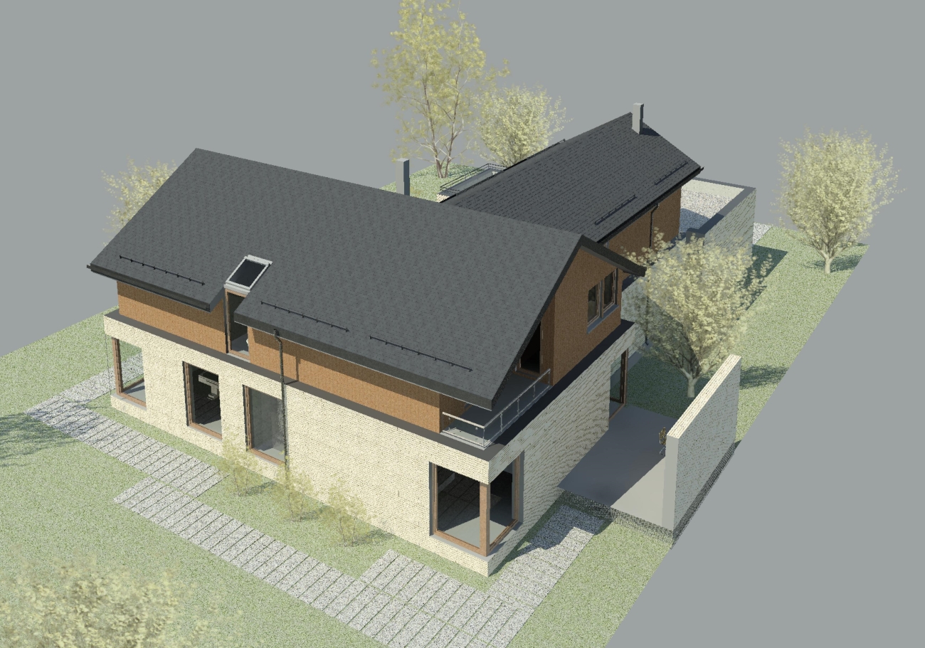 Dom w technologii murowanej, pietro - w technologii lekkiej, drewnianej.