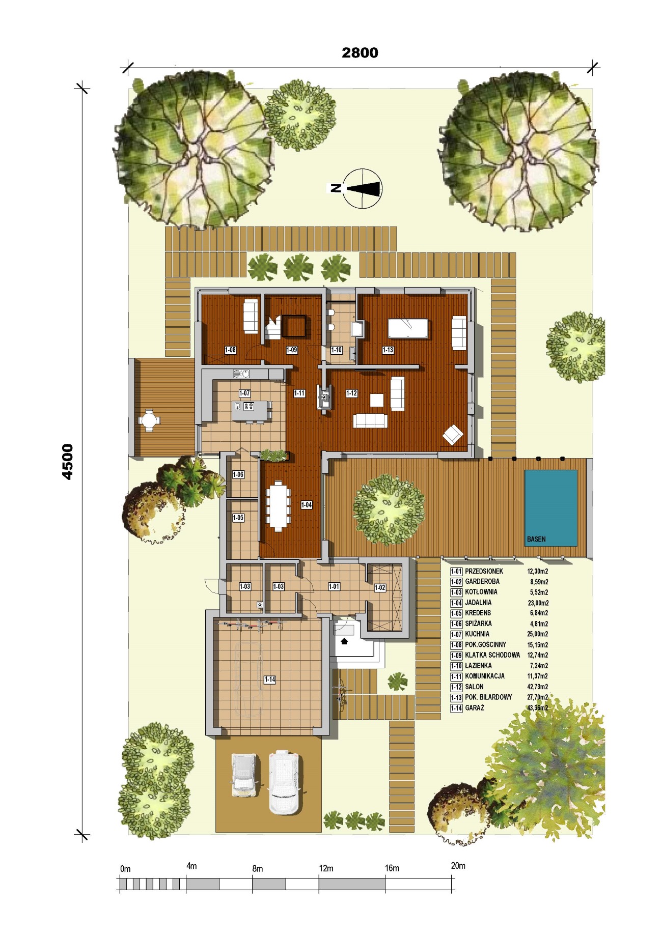 Dom z wewnętrznym patiem, na którym planuje się posadzenie centralnie drzewa - średniej wiekości brzoza - Betula pendula ’Youngii’ oraz aranżację niedużego basenu.