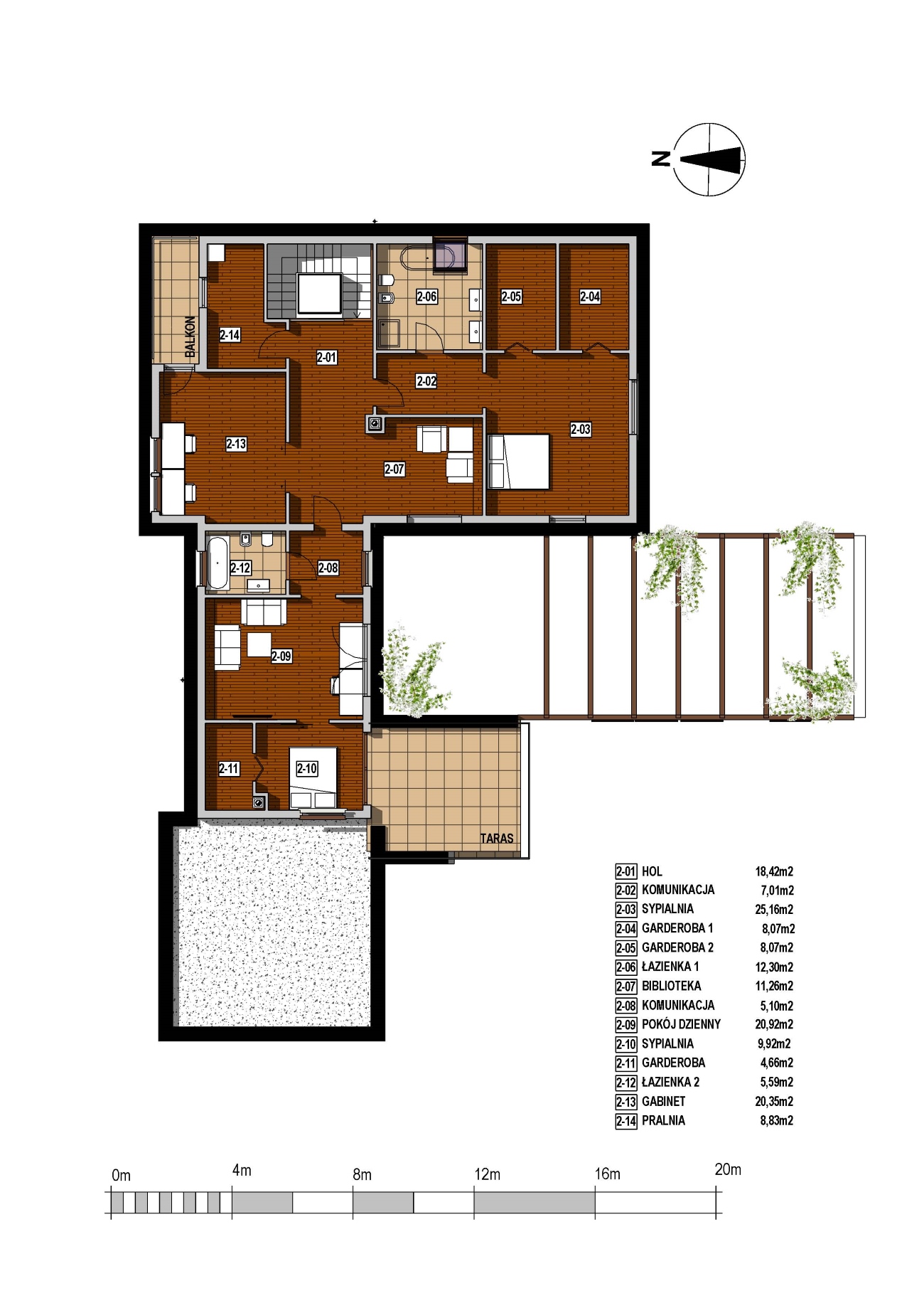piętro - gówna sypialnia z dwoma garderobami, "kawalerkaz tarasem" dla córki oraz gabinet z wyjściem na balkon.