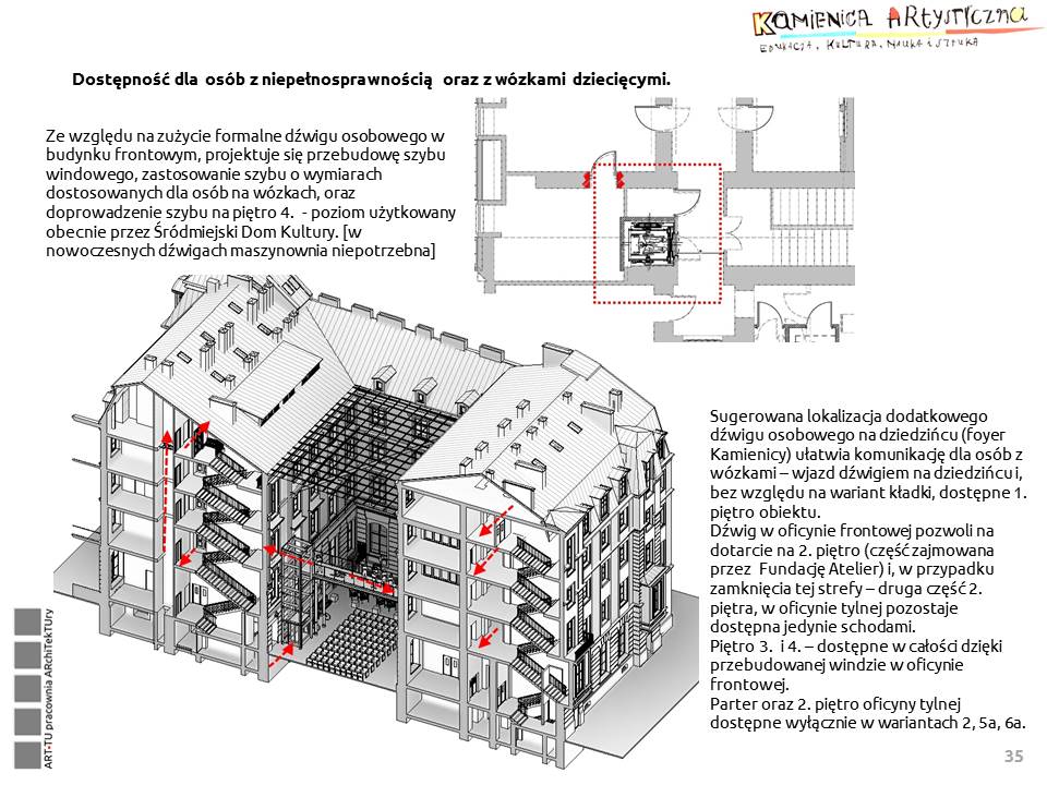Podstawowym problemem obiektu jest niedostosowanie dla osób z niepełnosprawnością. W klatce pierwszej znajduje się winda (wymieniona na nową kilka lat temu, ale nie spełniająca wymogów wymiarów minimalnych dla obsługi osób z niepełnosprawnością), dojeżdżająca tylko do trzeciego piętra, oraz niedostępną dla osób na wózkach/z wózkami, z poziomu terenu. Brakuje także toalet dla osób z niepełnosprawnością a istniejące toalety o zazwyczaj przestarzałym wyposażeniu i niespełniające wymogów „Rozporządzenia Ministra Infrastruktury w sprawie warunków technicznych, jakim powinny odpowiadać budynki i ich usytuowanie.”.