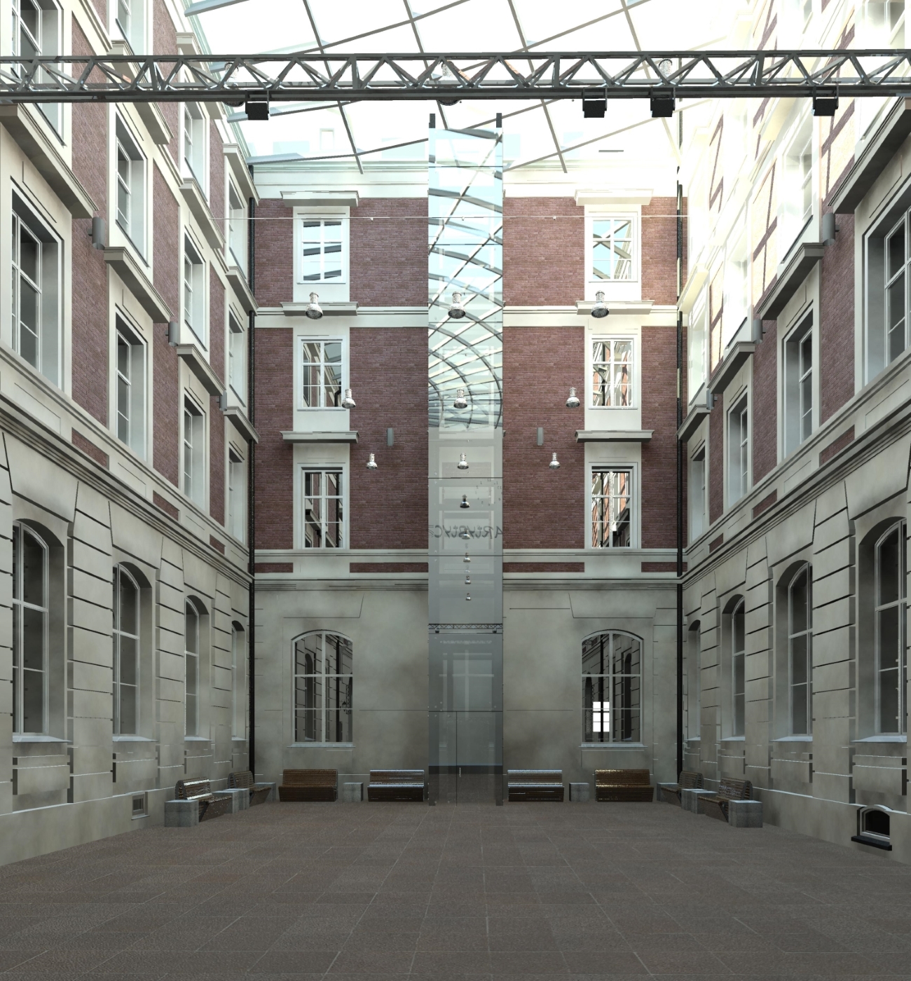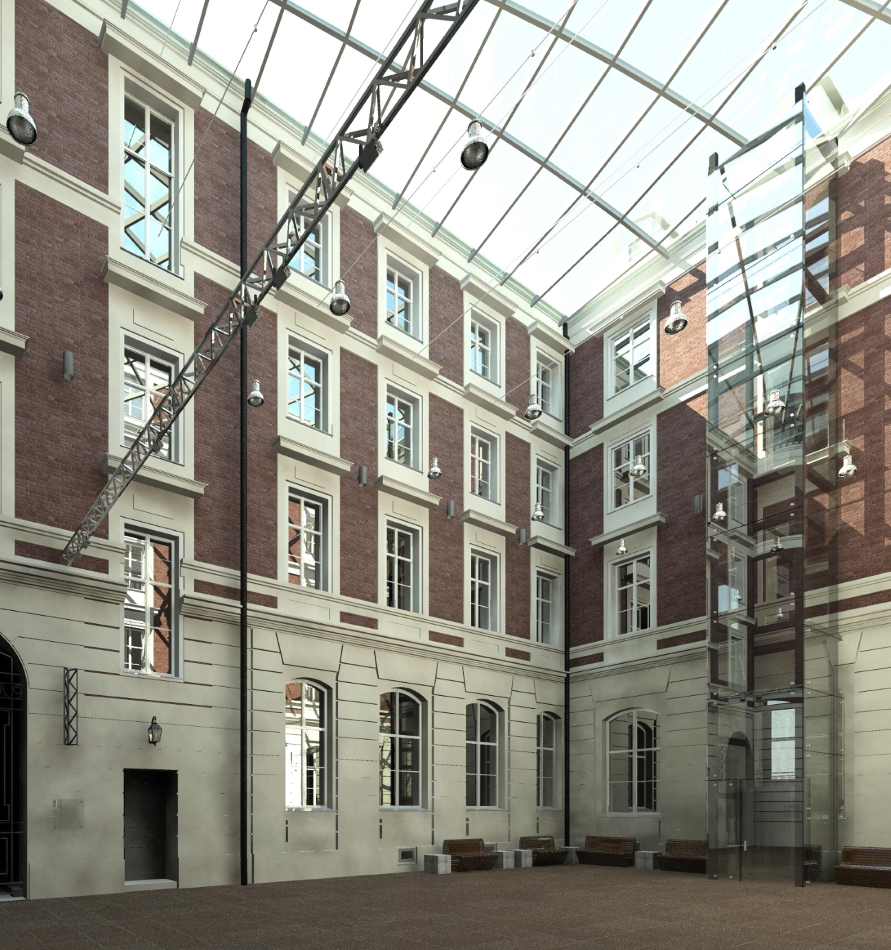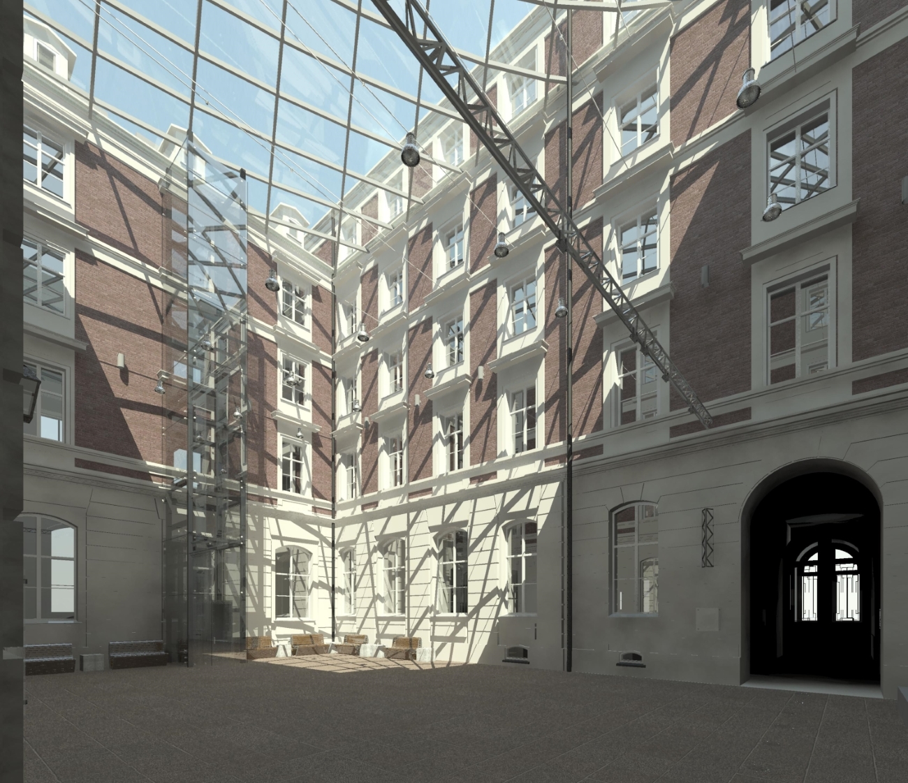 Wewnątrz obiektu znajduje się dziedziniec, użytkowany wyłącznie latem, głównie przez restaurację zlokalizowaną w południowo-wschodniej części parteru.