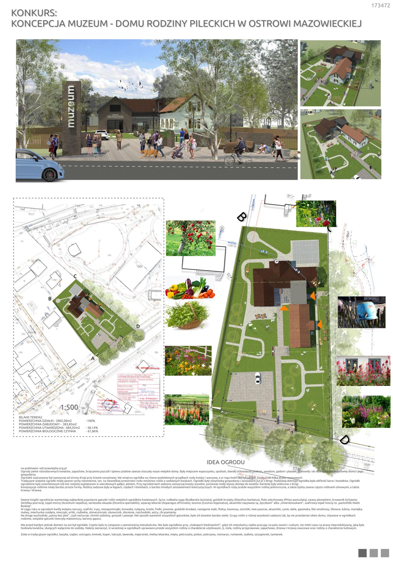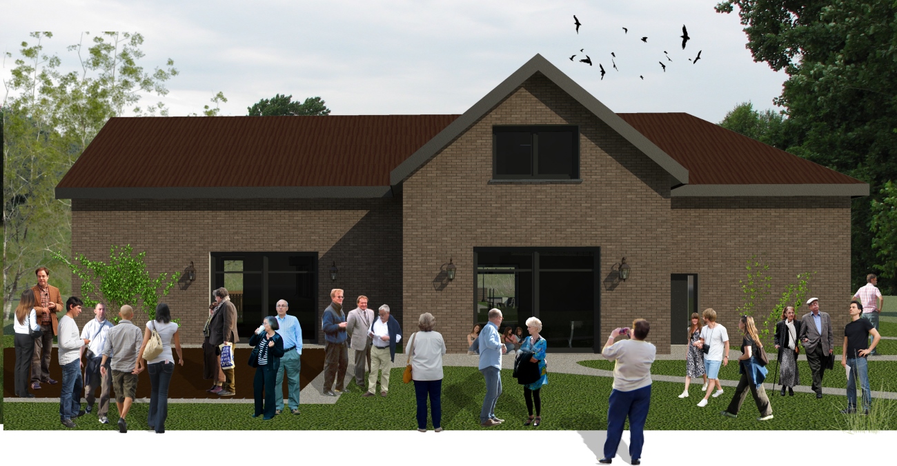 Zgodnie z wytycznymi Organizatora Konkursu, oraz zapisami MPZP*, projektuje się skromną spokojną architekturę wpisaną w zastany kontekst krajobrazu miasta, dawniej okolic wiejskich. Istniejący Dom, jego forma oraz nietypowa lokalizacja na działce, narzuciły formę oraz ostateczny wyraz architektury Muzeum.