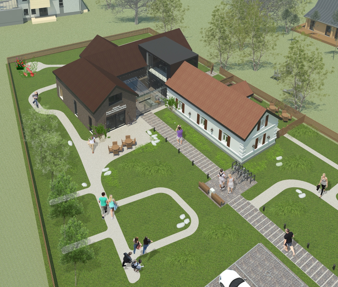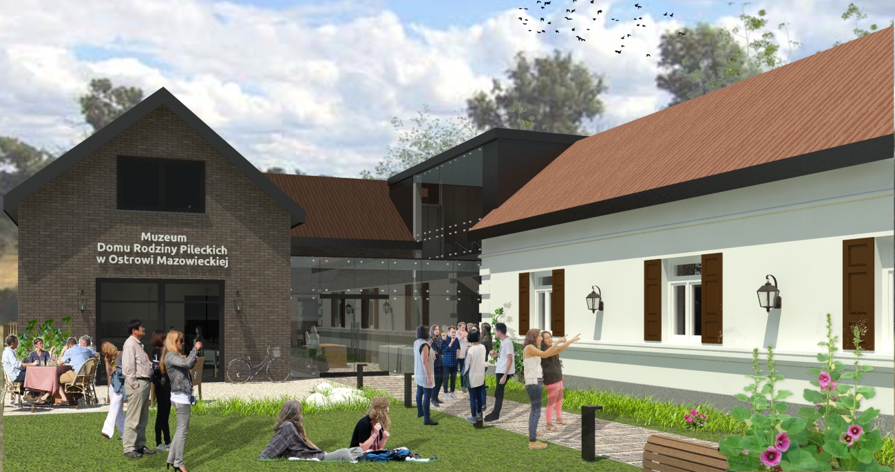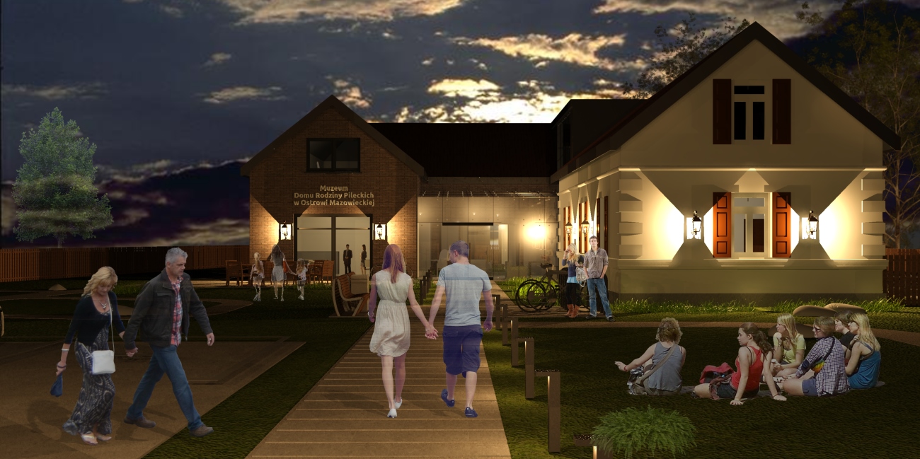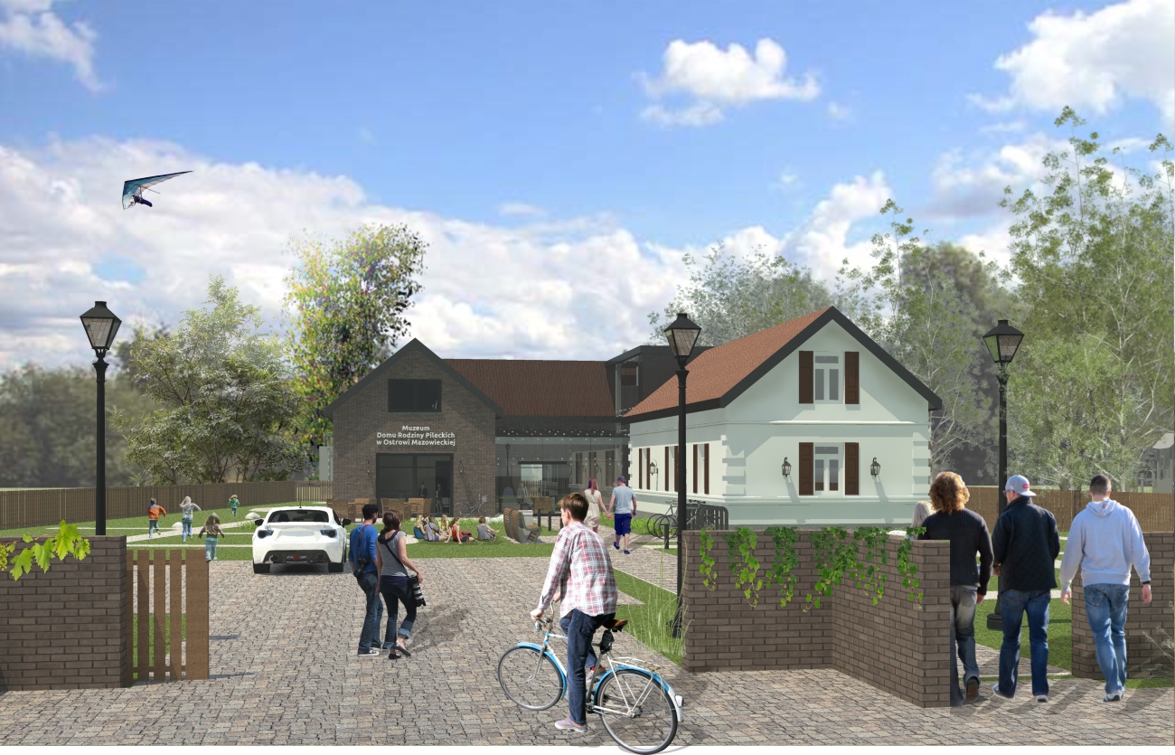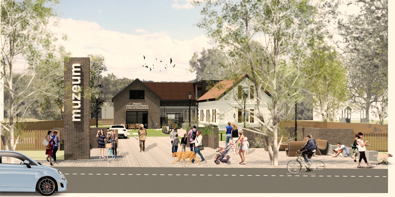 Ze względu na układ działki oraz lokalizację starego domu- wejście od strony północno-wschodniej, z wąskiego traktu między domem a ogrodzeniem, co, wg współczesnych zasad, czyta się jako wejście boczne, oraz sugerowaną w założeniach do konkursu lokalizację nowego budynku w głębi działki, za Domem, planuje się zmianę zjazdu na działkę oraz lokalizację głównego wejścia do obiektu w nowej części budynku, centralnie w stosunku do całego założenia.