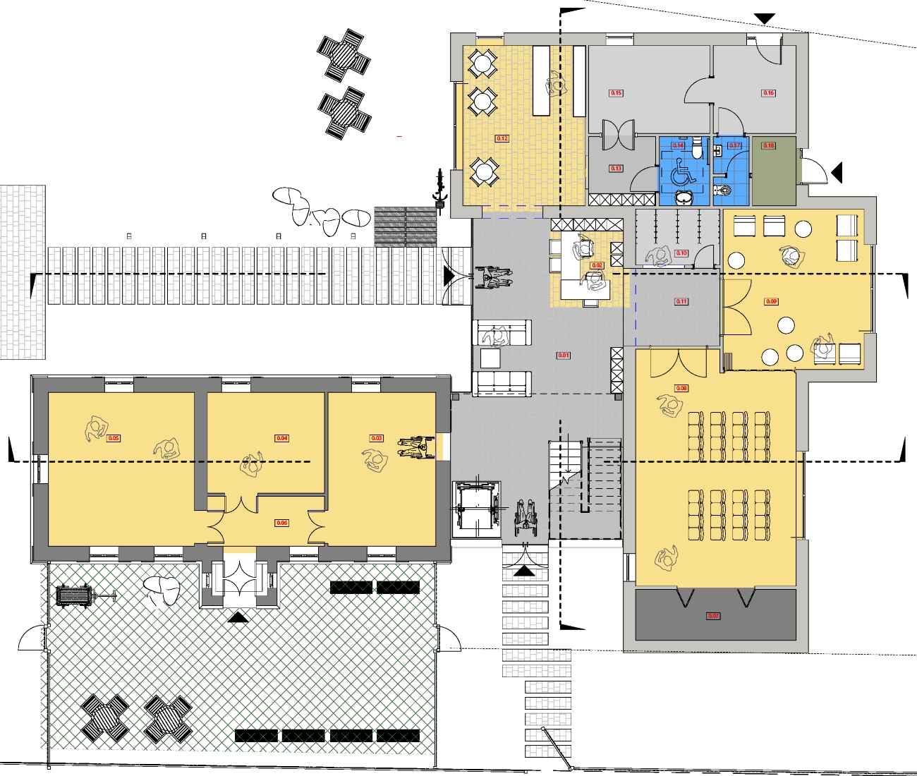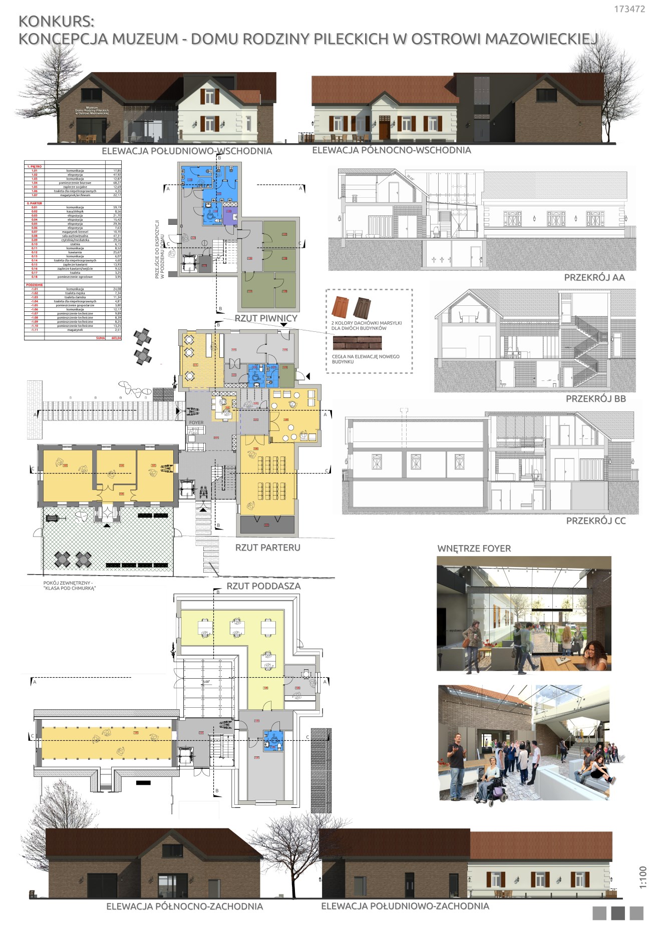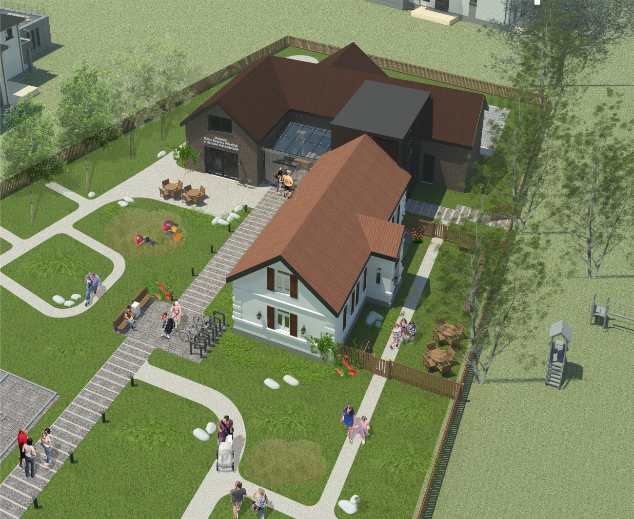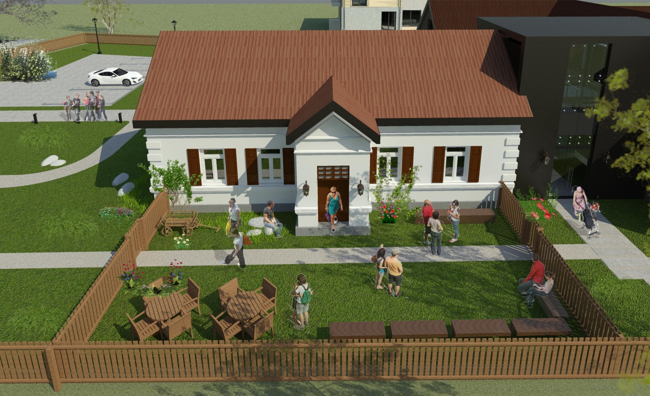 Ze względu na układ działki oraz lokalizację starego domu- wejście od strony północno-wschodniej, z wąskiego traktu między domem a ogrodzeniem, co, wg współczesnych zasad, czyta się jako wejście boczne, oraz sugerowaną w założeniach do konkursu lokalizację nowego budynku w głębi działki, za Domem, planuje się zmianę zjazdu na działkę oraz lokalizację głównego wejścia do obiektu w nowej części budynku, centralnie w stosunku do całego założenia.