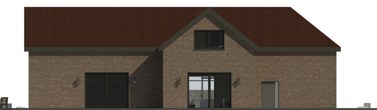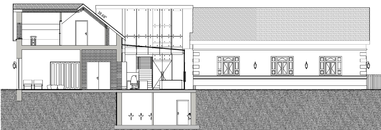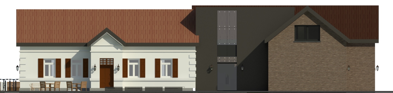 Budynki - Dom i nowoprojektowany obiekt - połączone zostały częściowo przeszklonym łącznikiem na poziomie umożliwiającym komunikację między dwoma budynkami o prawdopodobnie innych poziomach.