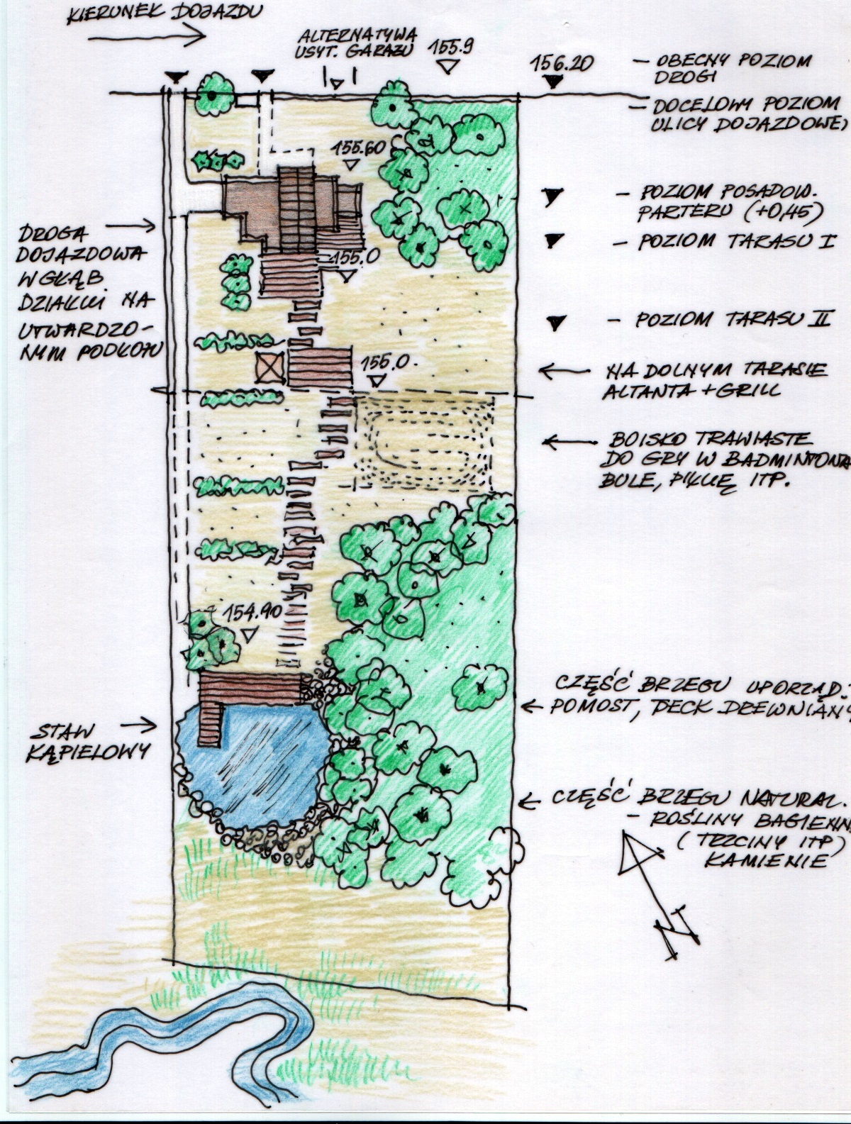 Szkic zagospodarowania trudnej, podmokłej działki w okolicach Mszczonowa.